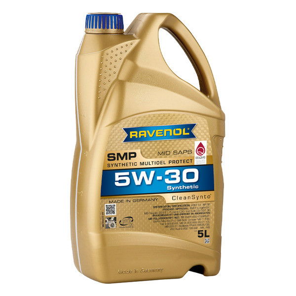 RAVENOL SMP SAE 5W-30 – sintetik, oson oqadigan, o‘rtacha kul tarkibli (MID SAPS) motor moyi bo‘lib, CleanSynto® texnologiyasi asosida ishlab chiqarilgan. Bu moy yengil avtomobillarning benzin va dizel dvigatellari uchun mo‘ljallangan bo‘lib, turbokompressorli va bezturbinali, shuningdek, to‘g‘ridan-to‘g‘ri yoqilg‘i purkash tizimiga ega motorlar uchun ham mos keladi. Ishqalanishni kamaytiradi, dvigatelning eskirishini oldini oladi, yonilg‘i sarfini qisqartiradi hamda sovuq ob-havo sharoitida mukammal ishlash xususiyatlarini ta’minlaydi. Avtomobil ishlab chiqaruvchilarning talablariga muvofiq uzaytirilgan moy almashtirish oraliqlariga ega.